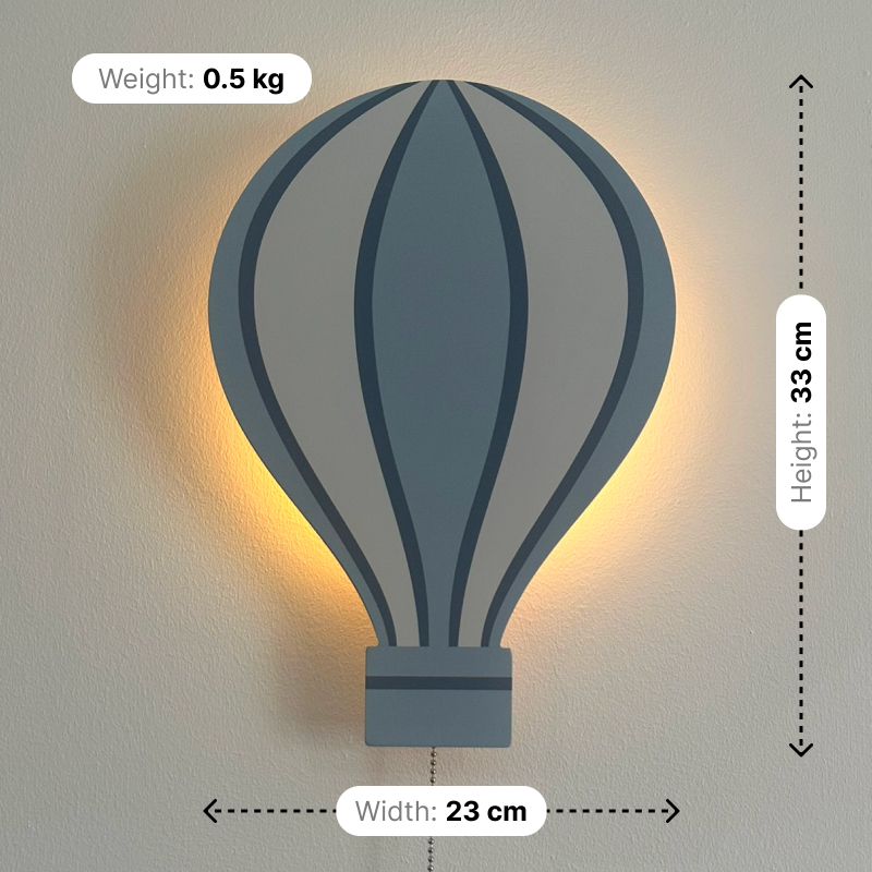 Float into a world of calm with this blue hot air balloon nursery wall lamp. Its serene colors and gentle glow set the scene for peaceful nights and imaginative dreams.