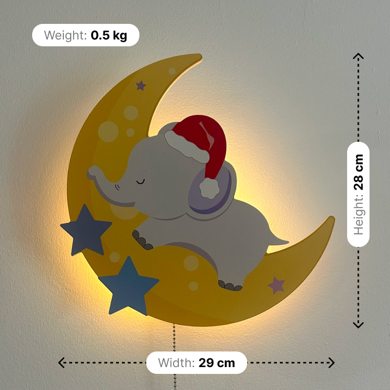 This nursery wall lamp features a sweet grey elephant in a Santa hat, peacefully napping on a crescent yellow moon with playful blue and purple stars. The perfect blend of holiday spirit and whimsical charm, it brings a magical, cozy glow to any child’s room.