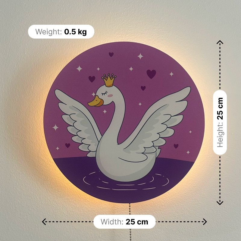 Grace your child’s room with this enchanting nursery wall lamp, featuring a regal swan adorned with a golden crown. Surrounded by sparkling stars and hearts, its gentle glow brings a touch of fairytale wonder and elegance to any nursery or kids’ space.